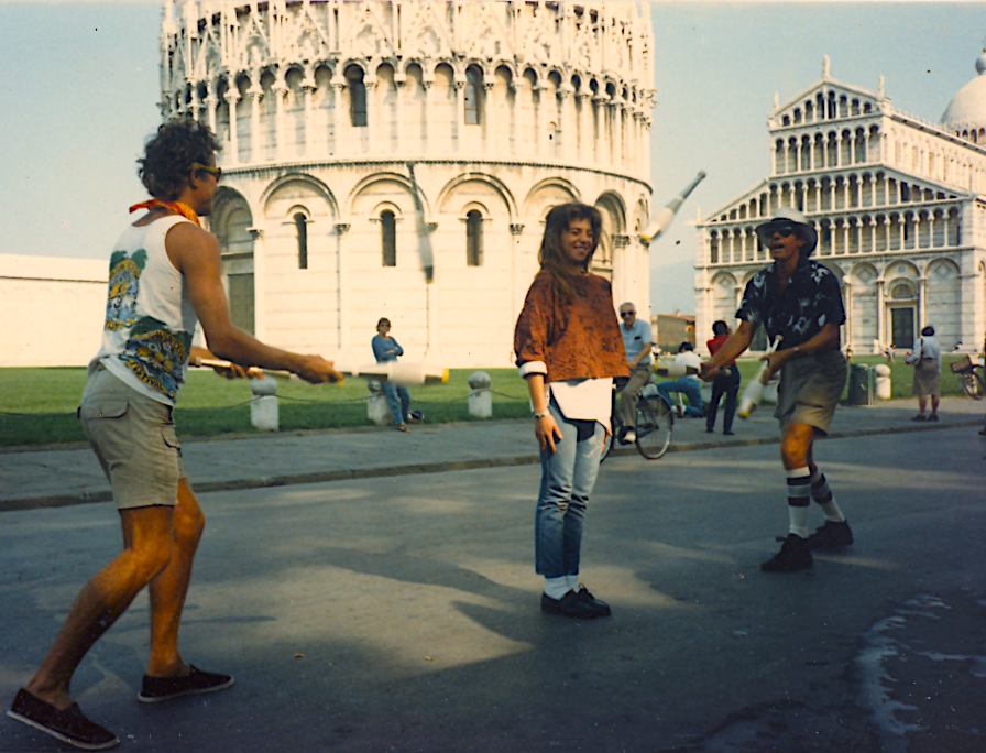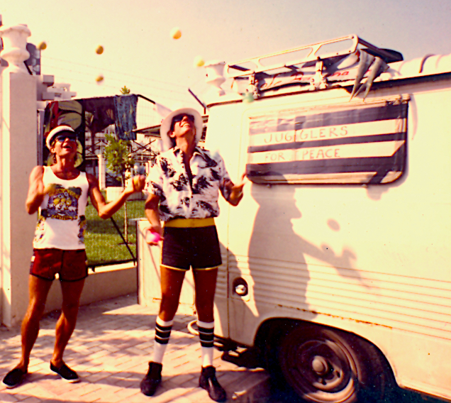 We drove first to Paris where, by chance, my friend Don Moody from Hilo, Hawaii was visiting. I’d taught him to juggle after performing in the “Comedy of Errors” show he directed and so he traveled with us via the Tower of Pisa and the beaches of Portugal to this surreal gathering of Europes jugglers. I was really glad we had a third crew aboard the bus because Butterfly’s on stage humourous personality wasn’t easy to live with off stage. When he was moody, irritable and often damn rude, it was good to have Don to hang out with. Butterfly had a seriously hard time letting go of his stage persona and just relaxing with his true self. Like many performers he was insecure, not liking or trusting his real life personality. I found this weird because, like many other friends of his, I grew to love the caring and considerate Robert Nelson who lived behind the butterfly mask.