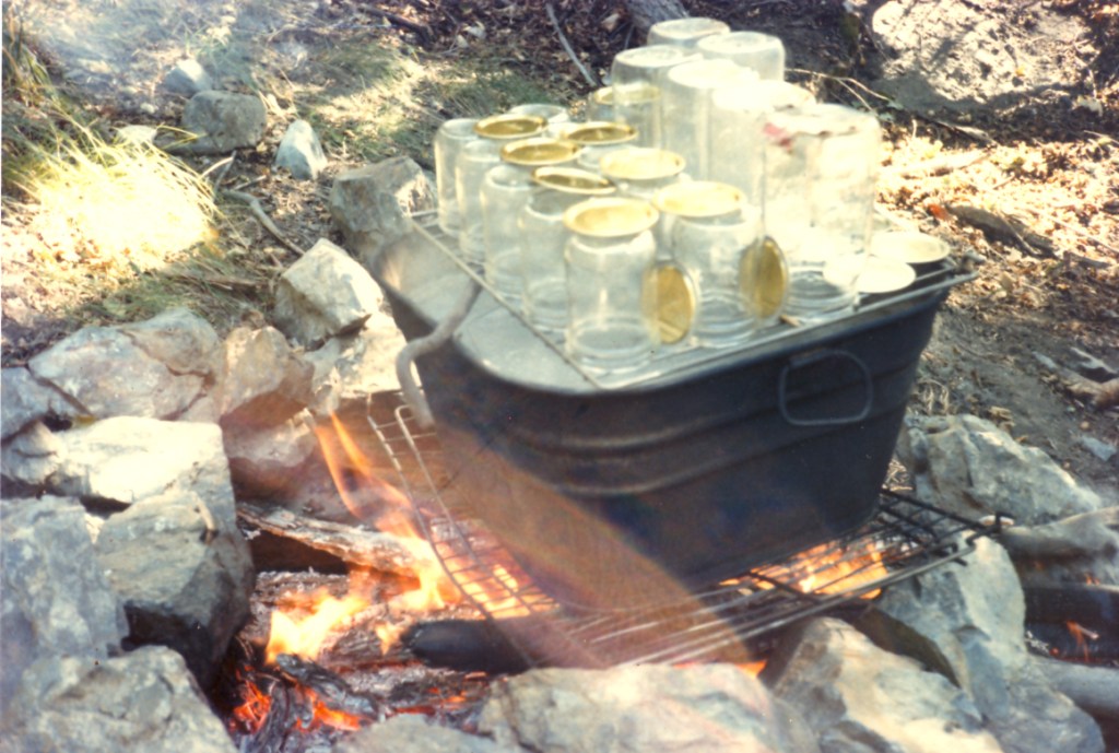 While on my visit, Angus suggested we do a bit of renegade fishing. Early in the day, we careened down a 1000 ft scree face to the river valley. It was like skiing, with broken rock instead of snow and heavy boots instead of ski’s. I was rather perplexed by our lack of any gear until Angus took me into a deserted miners shack and unveiled his secret stash. He described fishing Indian-style and, taking a hooped net on a pole, he walked out onto a rocky promontory sticking into the river and swept the implement through the murky, mud-laden water. I’d fished tiddlers in lakes, ponds and rivers and caught some whoppers off the back of sailboats and even hooked a couple of silvery salmon up in the Gulf Islands but I’d never experienced this form of fishing. On his very first demonstration sweep Angus netted a twenty pound sparkling beauty yelling gleefully, “this is how we do it up here.” Well, of course, I went next and did my sweeps, again and again. It must have taken me a hundred attempts before I replicated Angus’s success and realised how amazing his catch, in one try, really was. We landed about half a dozen then returned to the mine shack where we lit a fire. Using a big boiler pot and dozens of jars, Angus magically produced, we canned his winter supply of tasty fresh salmon just before dusk.