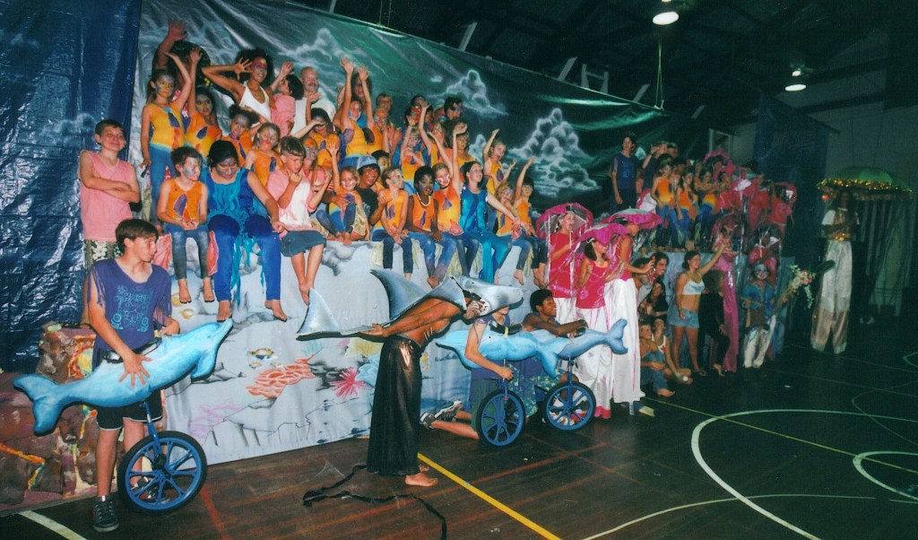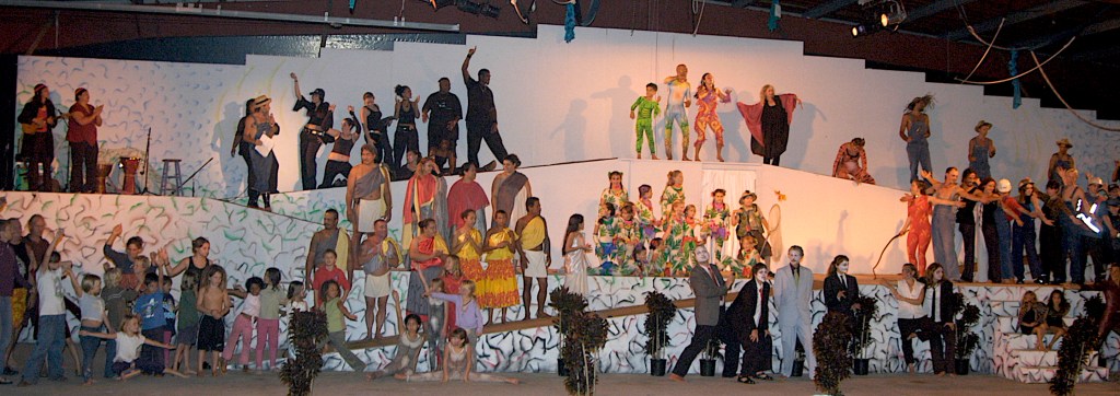 We ended the year with All Together for the Pahoa Hoāolaulea, our first large scale community production. Five community groups and our local public charter school collaborated with our classes and activities. It culminated in a huge turnout for the Pahoa Winter Parade, plus two performances of Ocean Life in the school gym. We followed up in 2004 with our fantastic Malama I Ke Kai āto take care of the sea,ā production. With its pageantry and elaborate costuming, our story featured unicycle dolphins, stilt-walking jellyfish, and a life-size humpback whale puppet. Over 160 local adults and kids collaborated as performers and support staff in two major presentations of the full 90-minute community spectacle.