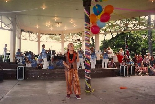 By 1993 our programs were really rolling, and I was actively seeking more exciting gigs for our kids, when I saw a request for proposals for First Night in Honolulu. On a whim I called the director, she turned out to be an English woman and I talked her ear off telling her about our amazing kids. Young people learning circus arts is fairly common today but back then it was extremely unusual and our program was the only one in the State of Hawaii.