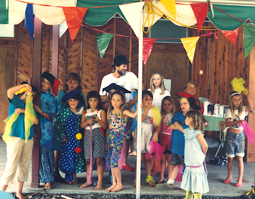 The HICCUP circus seed was germinated when I started weekly classes in September 1990 as an after-school activity at Malamalama School. Attendance grew rapidly to about twenty kids between the ages of seven and eleven and with her children, Eli and Ona, eager to learn juggling and other fun circus skills, Karolyn offered to help with teaching. Accepting her offer was one of my smartest moves. At the end of the 1990 school year we put together our first ever performance for parents and the general school body. No-one, including me and Karolyn, ever guessed that these kids would go on to perform in a multitude of shows over the next few years as the HICCUP circus mushroomed and became famous.