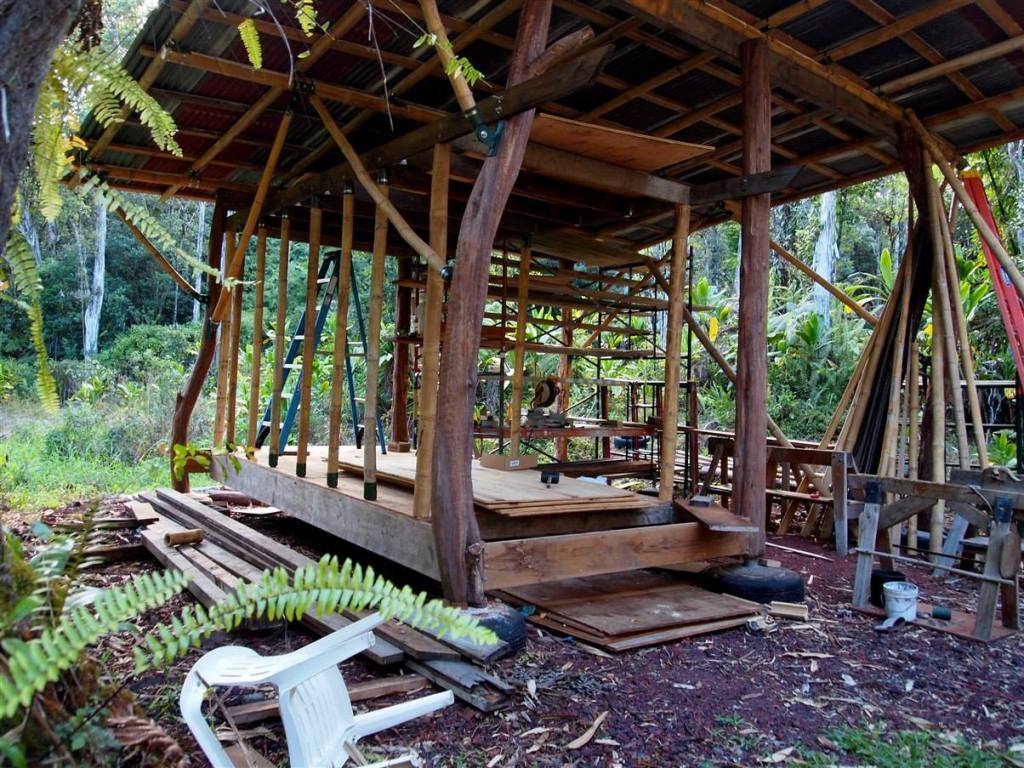 Leimana’s exploration of ways to build with bamboo continues on a daily basis. He recently built a small simple cottage, as an example of tropical independent living, applying old and new techniques with fun creative details. The roof of polycarbonate covers a 16’x24′ two interior rooms and two 8’x30′ exterior eves providing outdoor coverage and a location for solar panels. The floor is enclosed by 12″ diameter logs with the interior space filled with aggregate surfaced with concrete.