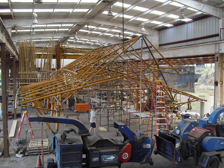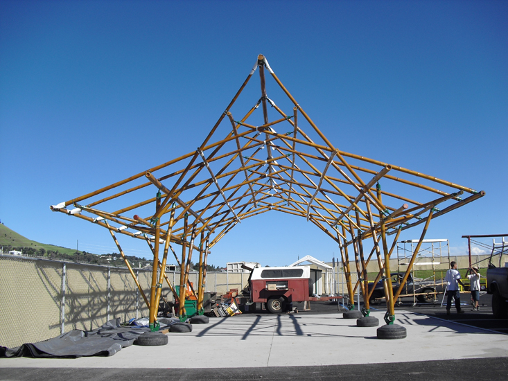 One huge obstacle he has faced is that bamboo dwellings in Hawaii were not covered by building codes. Through his determination along with other inspired innovators code changes are happening but still have a long way to go. In 2002 Leimana received substantial recognition from county officials and related industry leaders with grants to build five bamboo structures for recycling centers around the island. My architect juggling friend Dean Johnston worked with him on this project and the development of other beautiful structures. We all believed that this infant industry would become an important force in shaping Hawai’i’s economic and aesthetic future but that has not happened yet. Fortunately, as a Robin Hood renegade, the lack of legal approval has not prevented Leimana from building some amazing bamboo structures around the island.