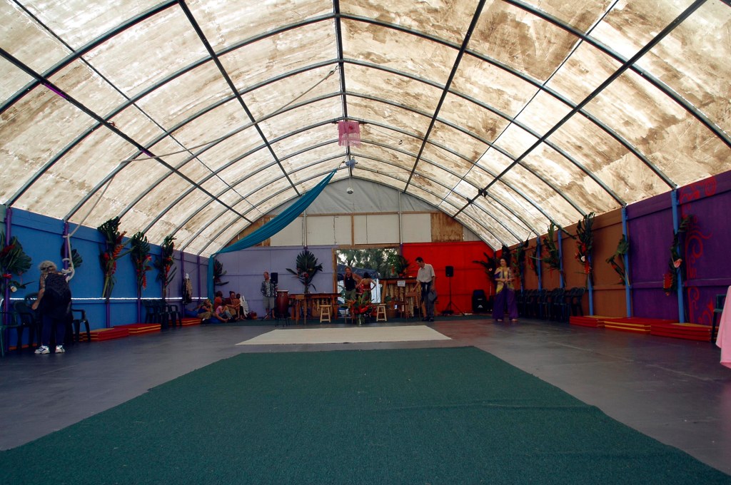 After six years of planning, designing, permitting and fundraising, the Seaview Performance Arts Center for Education (S.P.A.C.E.) eventually began construction in March 2007. We compromised on our original plans by first constructing a commercial greenhouse, using a professional to guide our own work crew in the pouring of the concrete footings and erection of the frame. After our interns helped install the recycled floor Tom and I magically manifested all the interior rooms and shelving in a couple of days using recycled 2×2 framing, plywood and doors. Phase One of S.P.A.C.E. was complete and we celebrated with a big community party, featuring the dancing rhythms of our resident marimba band.