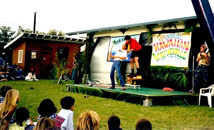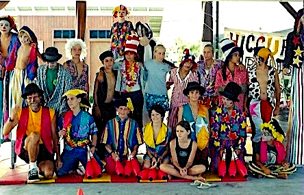 One example of our impact was the time a native Hawai’ian Uncle came to the pavilion and taught a large turnout of Seaview residents to make coconut woven hats and decorations for our parade float. Theresa, a deaf resident, sewed a huge string of colourful flags while two community association board members made a beautiful new Seaview Banner and stilt costumes for our HICCUP kids. On December 8th 2001 we had our biggest ever turnout for the Pahoa Winter Parade with Carlisle and Lynn wearing big beaming smiles driving about twenty of our proud seniors on board our ‘Castaways’ float followed by a large contingent of joyful HICCUP circus kids. We were the hit of Pahoa town that day and proudly won the people’s choice award for best overall group.