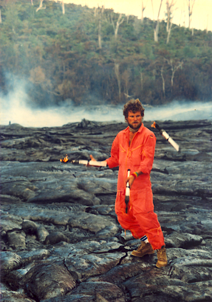 Out of the worlds 1,500 alive volcanoes Kilauea is the most active of all. It has been continuously erupting and flowing since 1983 and on it’s eastern flank, near the ocean, is where I bought land to build our jugglers community. Some would call it reckless, some might call it brash, impudent, kooky or harebrained but for my gang of renegade juggling friends it was just another over-adventuresome daredevil act. Many of us became addicted to trips up to the crater or active lava lakes to dance with the deity or just to stand in awe of it’s breath-taking formidable presence. The biggest lesson I learned was that nothing in this life is permanent especially the landscape on the sides of an active volcano. There was never any guarantee that Bellyacres would last for our lifetime.