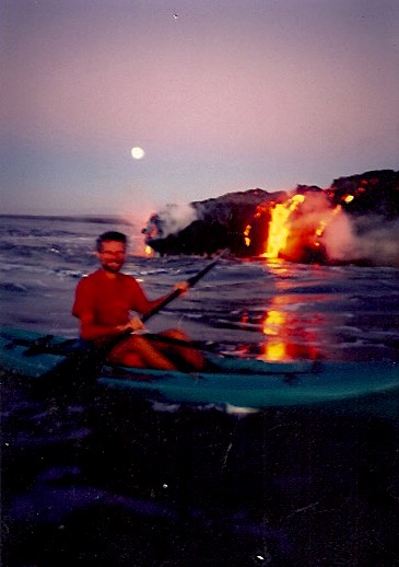 During these years of destruction and creation my friends and I continued our treks to pay homage to the venerable Goddess on land and on the sea. Henrik and I kayaked several times to watch the flow pouring directly into the Pacific ocean. We started our paddle at night with the full moon and felt the water grow warmer as we approached the billowing clouds of steam that often masked the red glow of the molten rock. I’m not sure about Henrik but I prayed earnestly for Pele to refrain from melting our plastic boats and to permit us a safe return. Apparently she heard me.