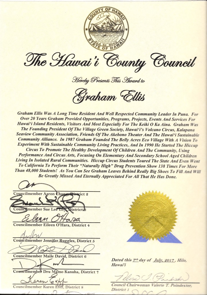 There was never any dispute that the majority of local Puna residents fully supported S.P.A.C.E. from conception. Over 1000 locals signed our petition requesting the County to grant us approvals for our activities. 243 submitted written testimony to the Planning Commission and hundreds made phone calls to the Mayors office. With newcomers changing the demographics—and some old timers growing grumpy about changes in the hood—by 2012 a handful of disgruntled denizens successfully created roadblocks in our progress building the social fabric of our community. Like most other long-lived social action groups, we had our share of challenges over the years and managed to overcome them but the legal and political quagmire that we found ourselves facing by 2014 proved overwhelming. S.P.A.C.E. was forced to close our beloved farmers market and curtailed most other activities and, after receiving online immigration threats from RJ and Sativa, I moved out of Puna with my family to start a new life in Waimea in 2015. In July 2017 I was eventually deported from Hawaii after a wonderful farewell party with friends at S.P.A.C.E. and was dearly touched to received a wonderful Appreciation Award from the Hawaii County Council just days before my departure.