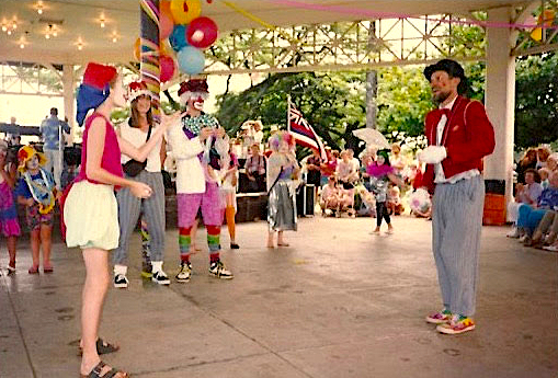 In the spring of 1992 after finishing my weekly class at the Hilo Bandstand I was approached by David Lorch leader of the Hawaii County Band who had been quietly observing our kids talents. He had a concert of children’s music coming up and he thought it would be a great idea to add our circus kids as visuals to his sounds. I was hesitant at first but, being a person who mostly embraced challenges, I eventually agreed.