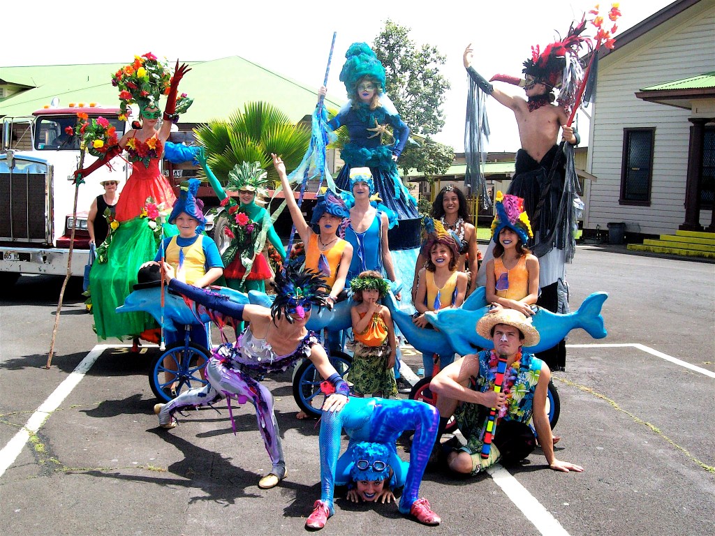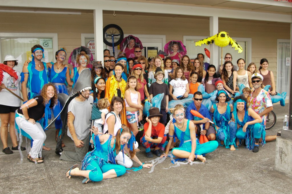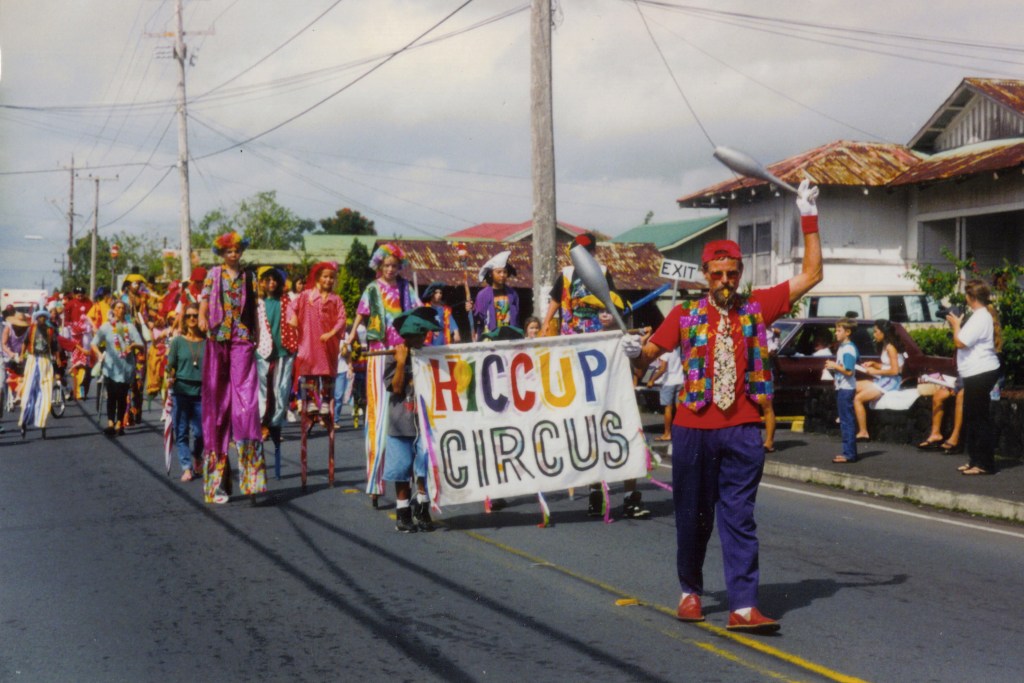 It became another tradition for us to attend to the annual parade celebrating the United Nations International Day of Peace in Honoka’a town. Our HICCUP clowns, unicyclists, stilt-walkers and costumed cirque performers were a featured act, marching in the parade, teaching local kids juggling and participating in the entertainment line up.