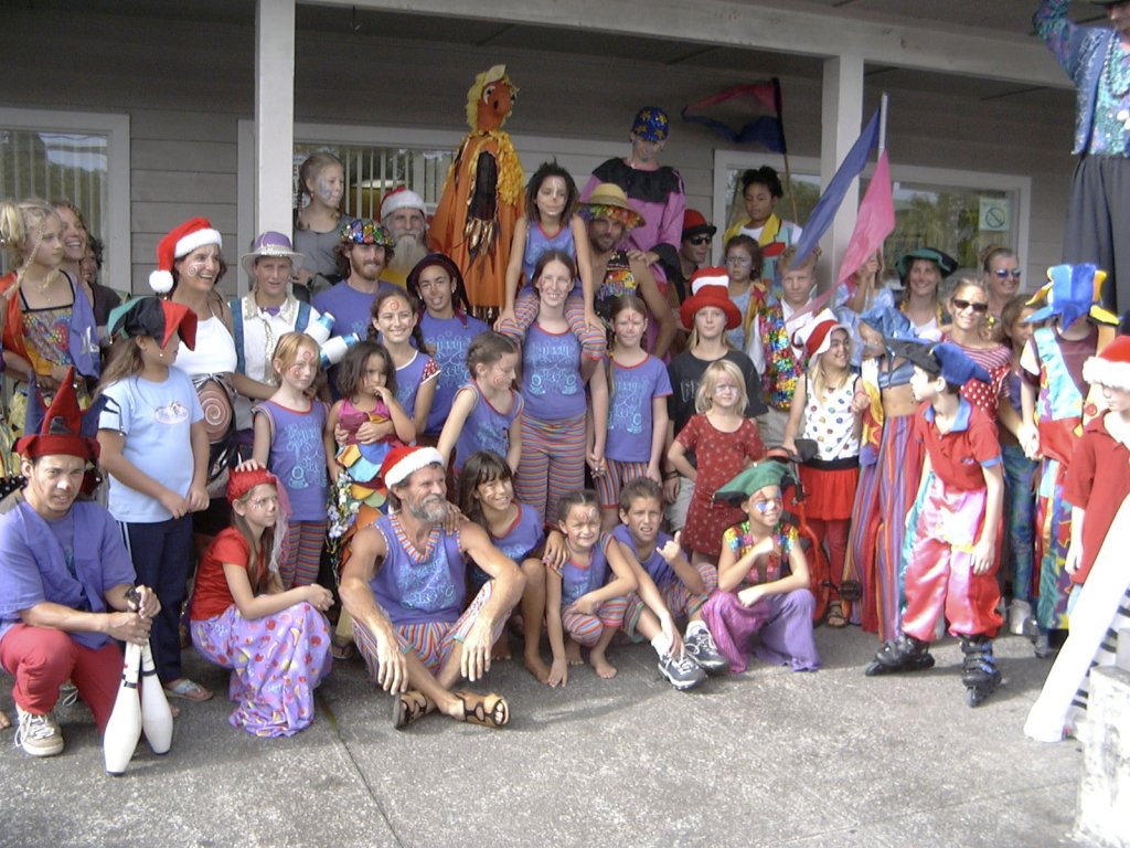 It all began following our first classes at Malamalama School in 1991. Stilt walking was initially the most popular activity and I accepted an invitation to bring a group to the Pahoa winter parade in early December. We marched behind a Malamalama School banner and thanks to great parental involvement we had built enough stilts for everyone and parents created flashy costumes and even classier make up. Everyone looked magnificent. For a start up group we set a really high standard and we made enough of an impression to get front page photo’s printed in the Hawaii Tribune Herald and an article written about our fun new circus activities available for Puna kids. Thanks to our paraders the interest in our circus classes grew exponentially.