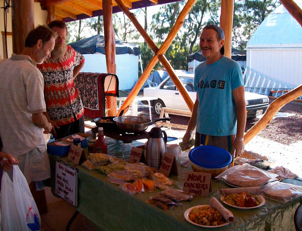 Week by week the numbers of people attending from all sectors of society grew steadily attracting longtime vendors who included: Larissa – Ukranian foods, Veronica – crystal jewellery, Wolf – masks, Tom – fruit, veg, smoothies, Kathy – pothead soup, Sahara – massage, haircuts, Yana – tie dyed clothing, John – omelettes, Raven – tarot card readings, Reiner – photography prints, cards, Ernesto – veggies, Banana Boys, Stone – silver jewellery, Vidipadidass – Tulsi drink, Susan – bread. We also had an Israeli guy who made pizzas in an oven made out of a recycled TV satellite dish and an old propane tank – probably the most creative cooking device we ever experienced.