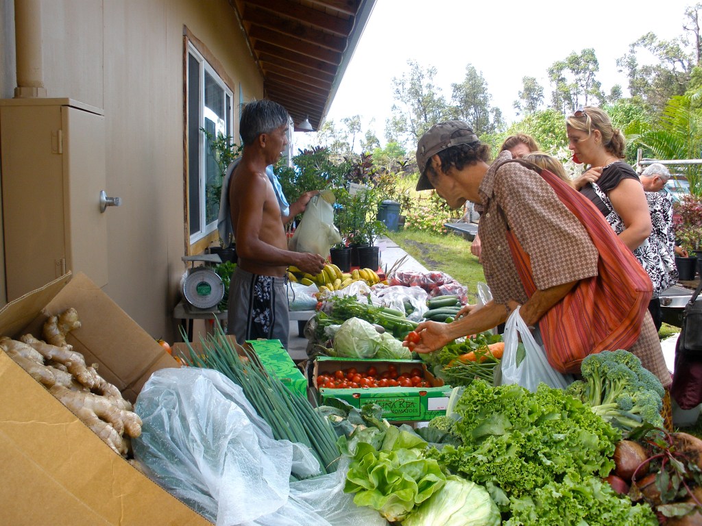 The needs of our neighbourhood were changing and community members who contributed in the creation of S.P.A.C.E. saw it’s potential for being much more than a home for the HICCUP circus. We had talented residents who wanted to use it for marimba, tap dance, ballet, theatre and drumming classes. Others talked about us hosting weddings, memorials, family and community gatherings, spiritual meetings and performances of all kinds. Uncle Robert’s was still just a family compound so the Akebono in Pahoa was our closest public venue for events and, following it’s refurbishment, was expensive and hard to book. Community is first and foremost about a sense of place and many residents wanted services available locally so we could build the fabric of our emerging village. When numerous people suggested starting a farmers market it was a no brainer.
