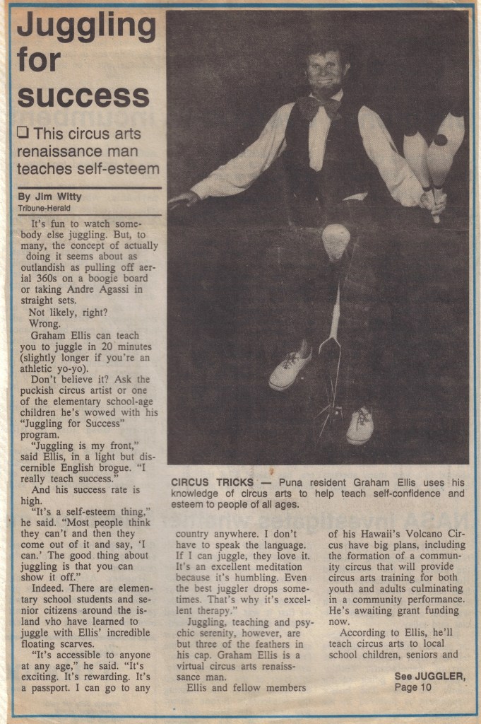 Between 1990 and 2014 I brought together a solid team and organised circus classes, summer camps, workshops, parades and performances of all sizes on six Hawaiian islands. Our circus kids were regularly featured in statewide newspapers, magazines, and even on TV. We presented well over two hundred school shows statewide and attended dozens and dozens of festivals, fundraisers and community events with audiences large and small from a diversity of cultures.