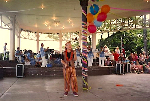 Our first public show was in the Hilo Bandstand accompanied by the Hawaii County band. I recruited the theatre skills and experience of my friend Don Moody to direct the show. He doubled as Yikes the clown and was remarkable herding my unruly newbies. Our presentation made a good impression because the band leader invited us to participate in a much bigger event at the prestigious university theatre three weeks later.