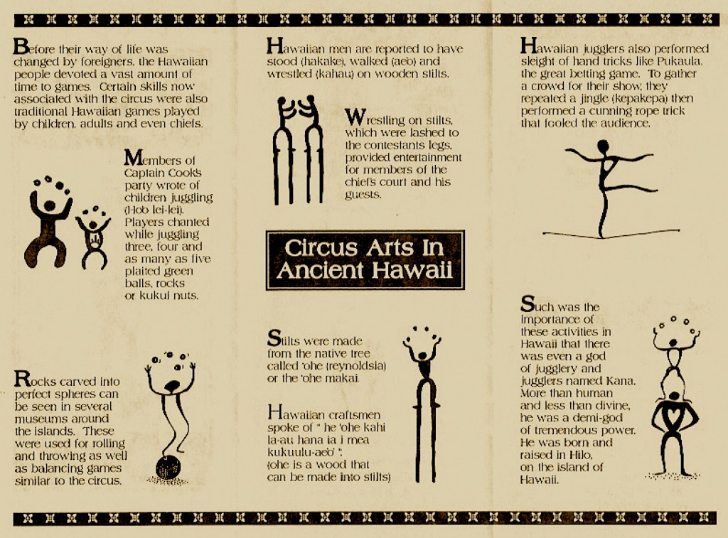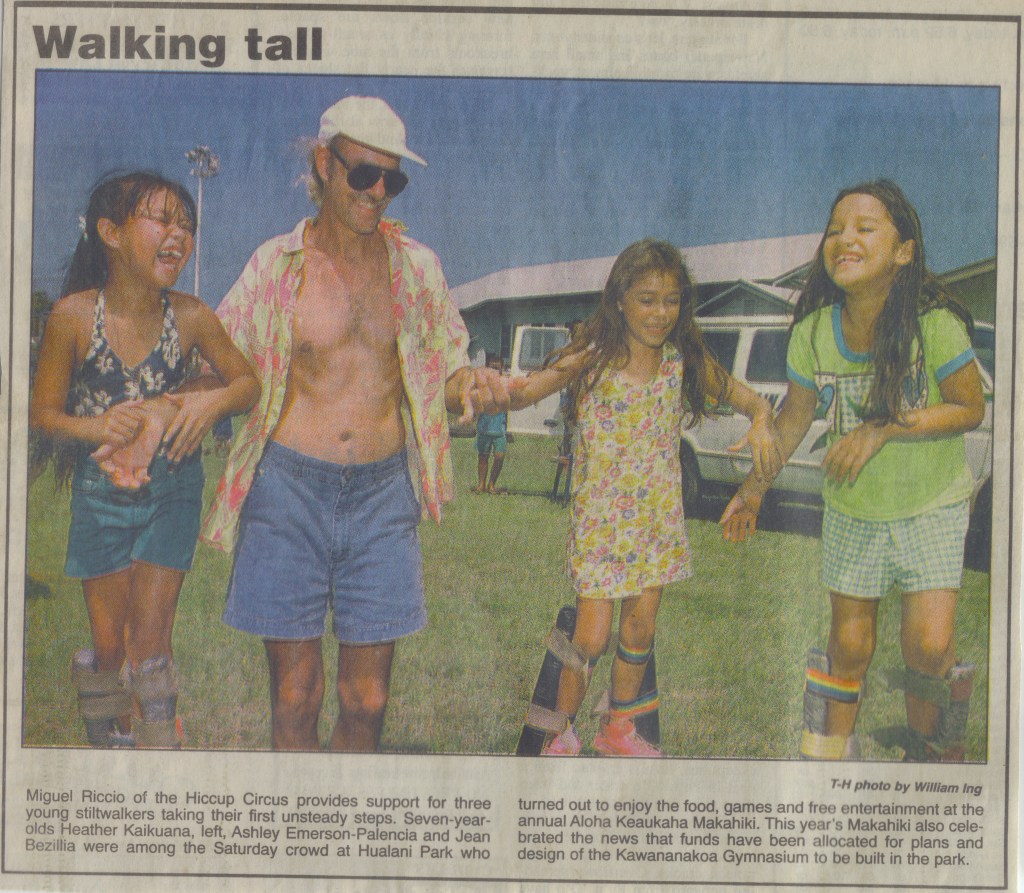 Learning circus skills takes lots and lots of practice which is not possible if students don’t have equipment available so, as I did with all my classes, I started letting my Hawaiian students take stilts and unicycles and juggling stuff home. The first week I did it Aunty Luella reported she had parents calling her up to check and see if the kids had stolen the gear or really had been allowed to borrow it. After giving them a reassurance I was lending it to them without any charge, but simply with an obligation to take care of it, I apparently won a lot more friends and the trust of these naturally generous people.